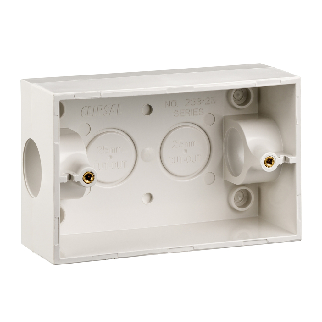 The BOX MTG PVC RECT 2X25MM has a part number of 238/25-WE, and is part of the Clipsal – Mounting Accessories range of products by Clipsal by Schneider Electric. Measuring at 70MM tall, 42MM wide, 116MM deep, and has a weight of 118G. The barcode of this product is 9311554089917.
