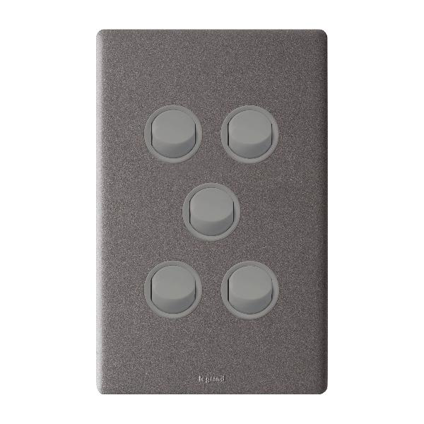 Excel Life – Dedicated plate – Vertical rocker switch – 16AX 2 way single Pole Double Throw – 5 gang 16AX 240V a.c. urban grey