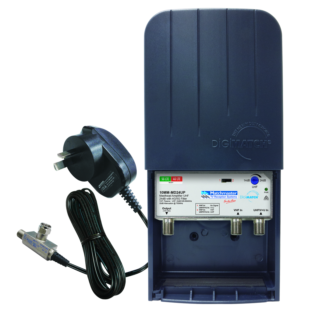 4G and 5G LTE filter built in from 694MHz. Filter Attenuation @ 750MHz: >30dB at maximum gain for UHF of 24dB