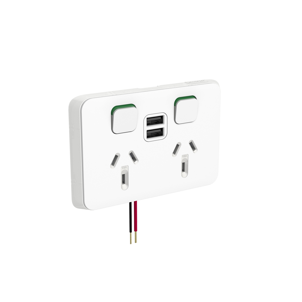 Clipsal Iconic, 2 switched socket, hori, 2 USB charger, 250 V, 10 A, Vivid White