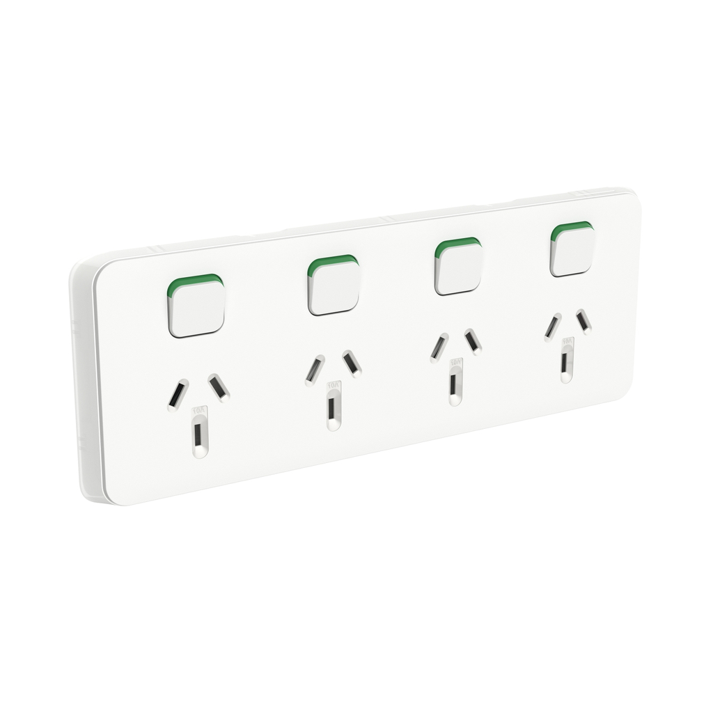 Clipsal Iconic, switched socket, 4 switch & 4 socket, horiz, 10 A, Vivid White